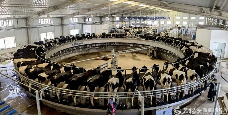 4月19日,温宿县天原牧业牧场内,60位转盘式挤奶设备上,奶牛整整齐齐列队完成挤奶。
