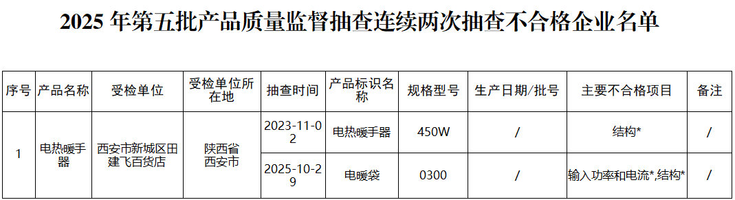 2025年第五批产品质量监督抽查连续两次抽查不合格企业名单