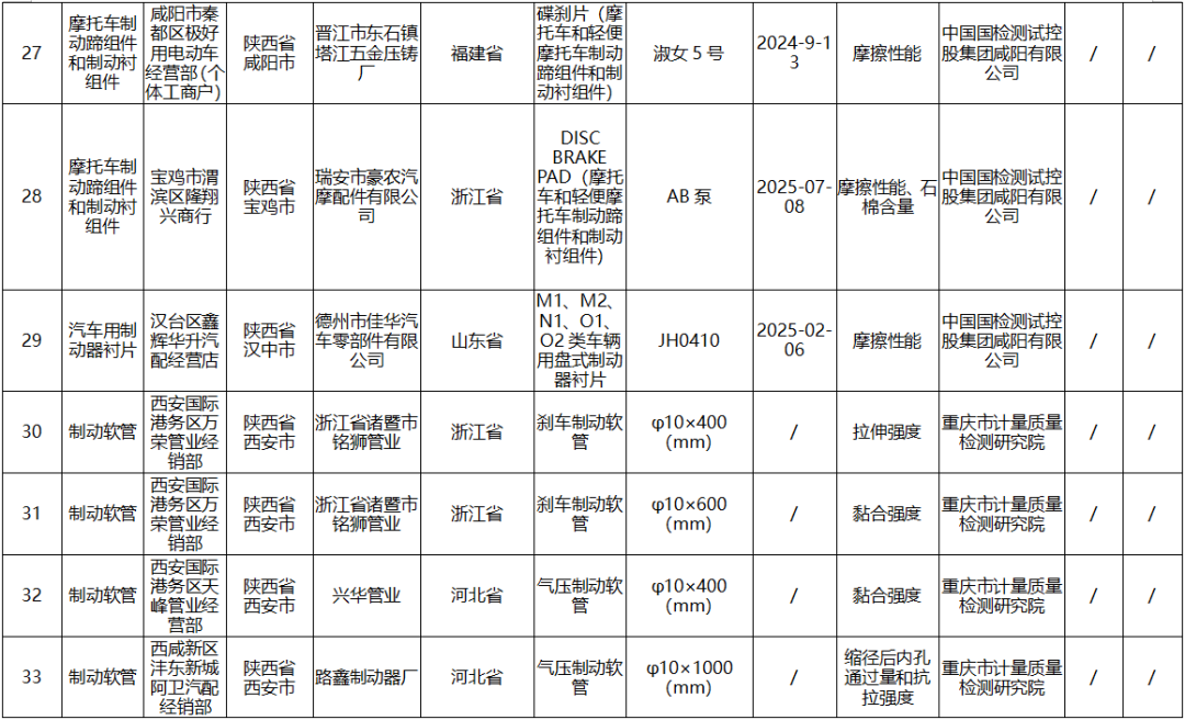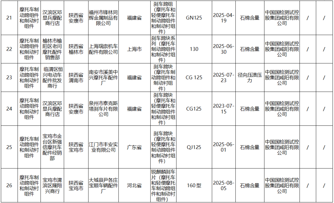 在西安、宝鸡、咸阳、铜川、渭南、榆林、汉中等地区生产及流通领域抽查了47家企业生产销售的66批次产品。抽查发现1批次产品不合格,不合格项目为摩擦性能。