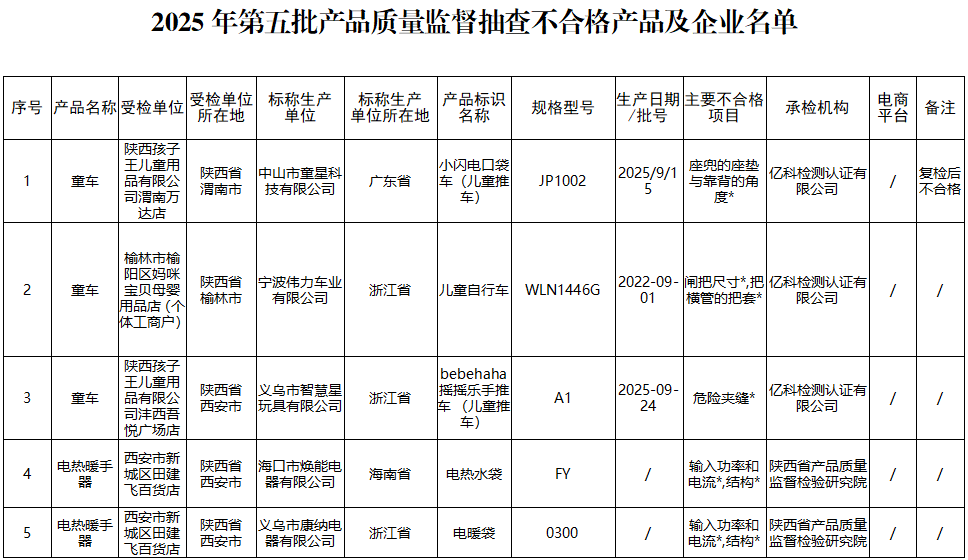 2025年第五批产品质量监督抽查不合格产品及企业名单