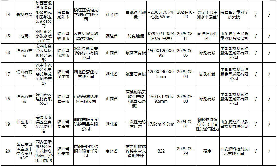 在西安、咸阳、渭南等地区流通领域抽查了12家企业销售的20批次产品。抽查发现2批次产品不合格,不合格项目为光学中心单侧水平偏差。