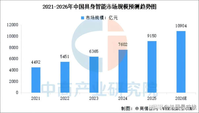 中商产业研究院的数据同样指向了相似的趋势,2025年中国具身智能市场规模约9150亿元,同比增长20.4%。其分析师预测,2026年中国具身智能市场规模将达到10904亿元,具身智能机器人解决方案市场规模则将达到449亿元。