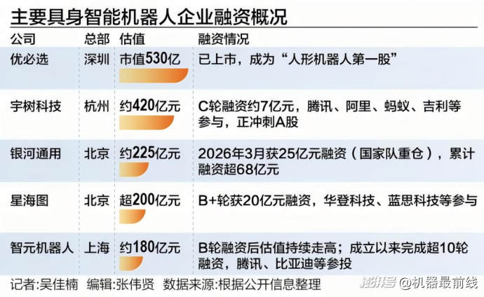 2026年,资本的热钱仍在加速向头部集中,截至目前,国内估值达百亿元的具身智能企业已有13家,宇树科技、银河通用、智元机器人、星海图等名字频繁出现在同一张榜单上。其中,宇树科技在IPO发行阶段的估值已达到约420亿元,银河通用则在今年3月完成25亿元融资、估值约210亿元。