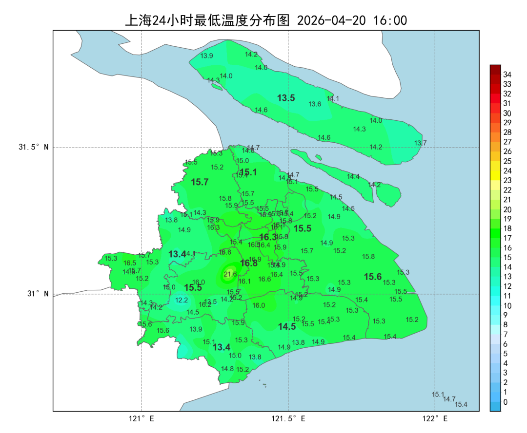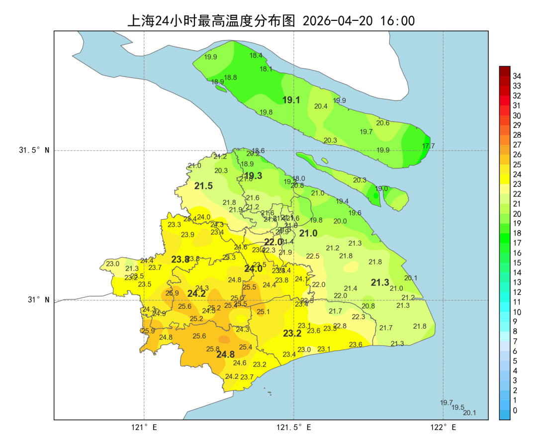 受辐射降温影响,昨夜今晨,崇明、松江的个别站点出现大雾。日出后雾气消散。中午以前本市以多云为主,大部分地区的最高气温在19~25℃之间,徐家汇站最高气温22.0℃,体感温暖。下午受冷空气扩散影响,云系增多,北风增大,气温下降。
