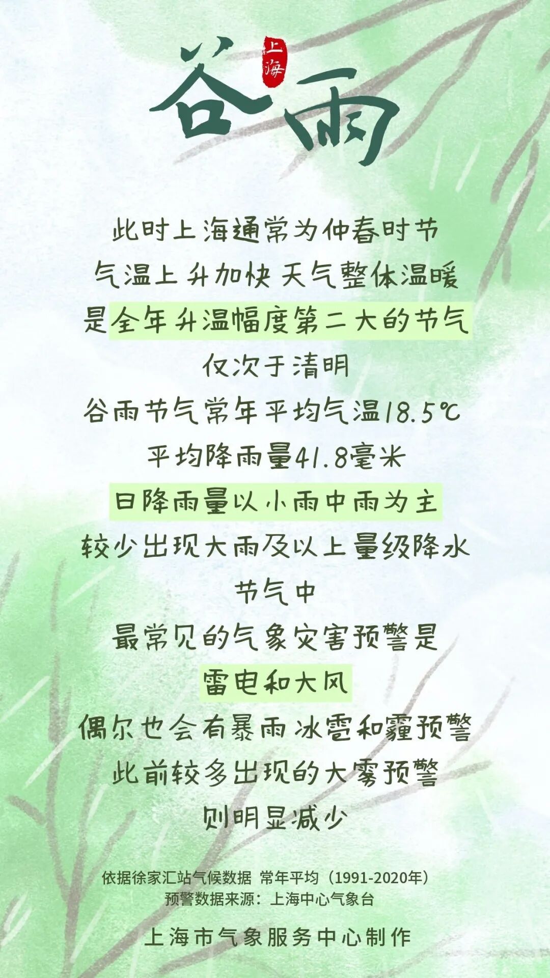 “谷雨”节气,是二十四节气中的第六个节气,也是春季的最后一个节气,此时上海通常处在仲春时节。