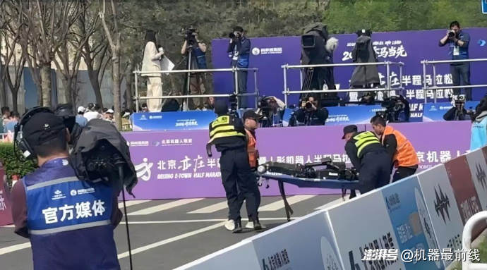 不过在实际正赛中,宇树H1的表现略显波折。网络流传的视频显示,它在换电起跑后几秒内摔倒,头部磕地导致碎片散落。据央视新闻报道,其补能环节需要三人同时操作,一人换电、一人装填冰块给芯片降温、一人在关节处喷射散热剂,整个流程约30-40秒。