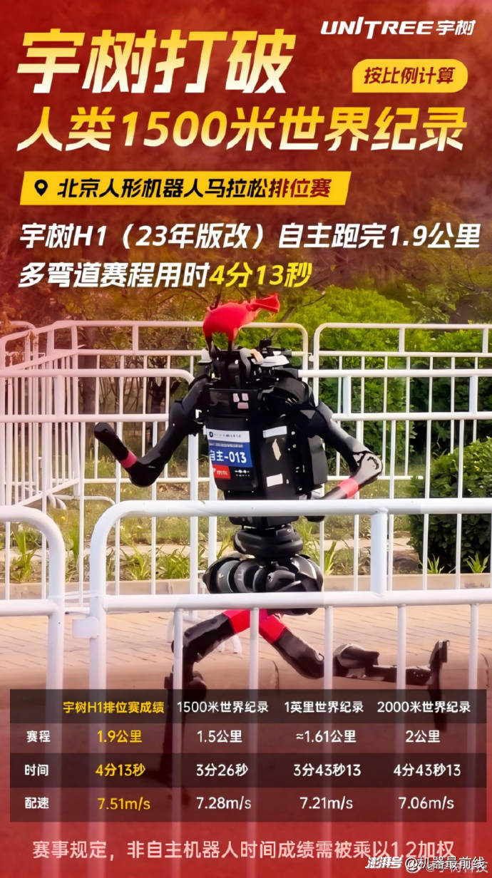 在赛前测试中,宇树H1展现出了惊人的速度潜力。4月16日的排位赛上,它自主跑完1.9公里多弯道赛程,用时4分13秒,按比例计算已打破人类1500米世界纪录。宇树方面还表示,H1近期已跑出10m/s的成绩,接近博尔特10.44米/秒的人类极限速度。