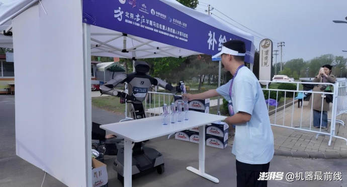 在赛道补给站上,星海图携R1 Pro、R1 Lite亮相,化身“机器人服务官”。赛事沿线共设4个补给站点,全线均由星海图机器人进驻服务,以全自主、无遥控方式动态递补,全程为参赛选手提供递水、递毛巾、补给品分发等服务。