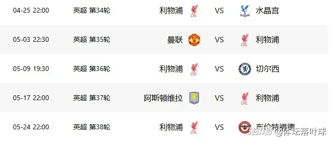 利物浦最后五轮的对手是:水晶宫(客)、曼联(主)、切尔西(客)、维拉(主)、纽卡斯尔(客)。五场比赛四个客场,三个对手是争夺欧战资格的直接竞争者。