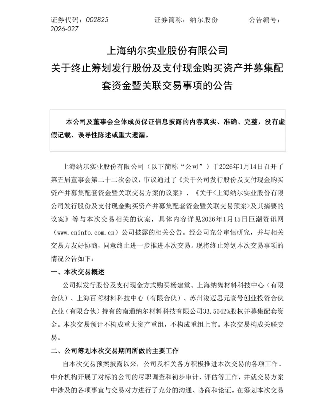 对于终止原因,纳尔股份表示,历经三个多月磋商,各方在交易价格、业绩承诺、标的资产估值定价等核心条款上始终无法达成一致,交易方案已不具备可行性,为维护公司及股东利益,公司决定终止交易。