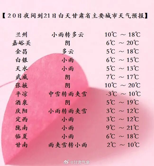明天夜间到后天白天(04月21日20时-04月22日20时),甘南、陇南两州市阴转多云,局部地方有小雨(雪)或雨夹雪;省内其余地方晴或多云,祁连山区阴有小雪或雨夹雪。