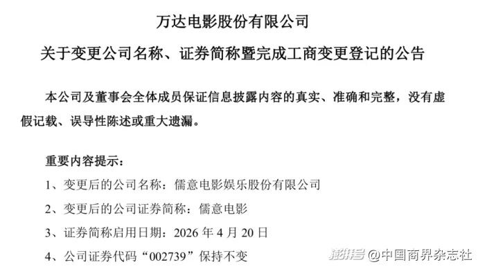2026年3月27日,万达电影就发布公告,宣布拟更名为“儒意电影娱乐股份有限公司”。公告透露,更名是为了更好地契合公司战略转型方向,万达影城作为儒意电影旗下重要的影城品牌之一,将继续为用户提供优质的观影与线下娱乐服务。