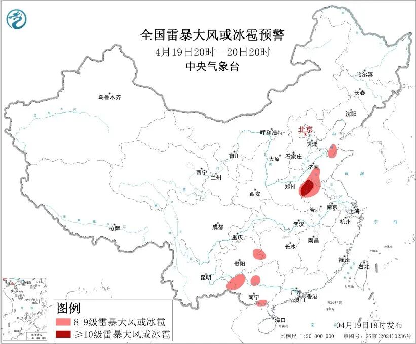 预计4月19日夜间至20日20时,黄淮、西南地区东部、华南西部等地的部分地区将有8级以上雷暴大风或冰雹天气,其中,山东西南部、河南东部、安徽北部等地的部分地区将有10级以上雷暴大风,最大风力可达11级以上;黄淮中部、西南地区东部、江南西部、华南北部等地的部分地区将有小时雨量大于20毫米的短时强降水天气,其中,湖南南部、广西东北部、广东西北部等地的部分地区小时雨量大于50毫米,最大可达60毫米以上。