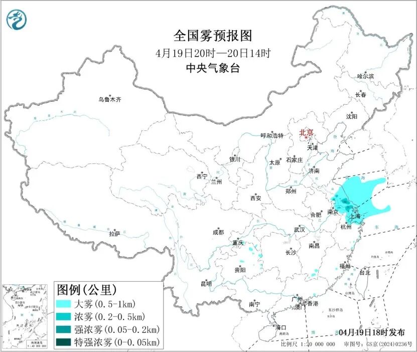 中央气象台4月19日18时继续发布大雾黄色预警