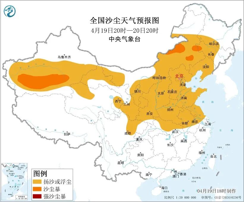 受冷空气大风影响,预计4月19日夜间至20日20时,新疆东部和南部、青海西北部和东部、内蒙古中东部、甘肃中东部、宁夏、陕西、山西、北京、天津、河北、山东、河南、吉林中西部、辽宁、安徽中北部、江苏中北部、湖北北部、四川盆地北部等地的部分地区有扬沙或浮尘天气,其中,内蒙古中东部、新疆南部等地的部分地区有沙尘暴。