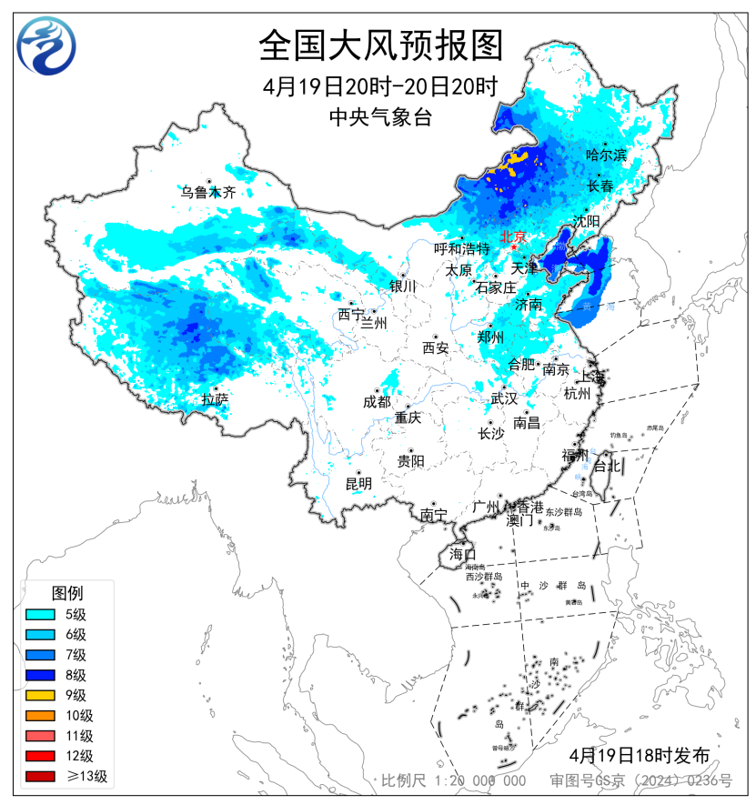 预计,4月19日夜间至20日20时,新疆南疆东部和南疆盆地、西藏大部、青海西部、甘肃河西、内蒙古中东部、东北地区大部、山西北部、河北北部、北京、天津、黄淮大部、苏皖中北部等地部分地区有5~7级风,阵风8~9级,其中新疆东部山口、西藏北部、内蒙古中部局地有8~9级风,阵风10级以上;渤海、渤海海峡、黄海北部海域、黄海中西部和西南部部分海域将有7~8级、阵风9级的大风。