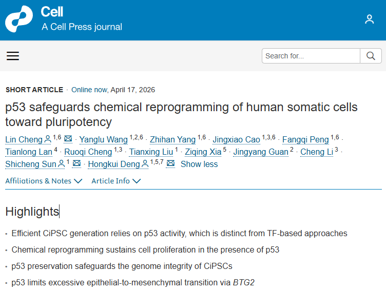 近日,北京大学邓宏魁院士领衔在国际顶尖期刊《Cell》发表题一项重磅研究。研究发现关键肿瘤抑制因子p53在化学重编程中发挥核心保护作用,打破了“p53阻碍细胞重编程”的传统认知。揭示了p53在诱导多能干细胞生成中扮演的全新、关键角色,这从根本上改变了我们对细胞重编程安全控制机制的理解。