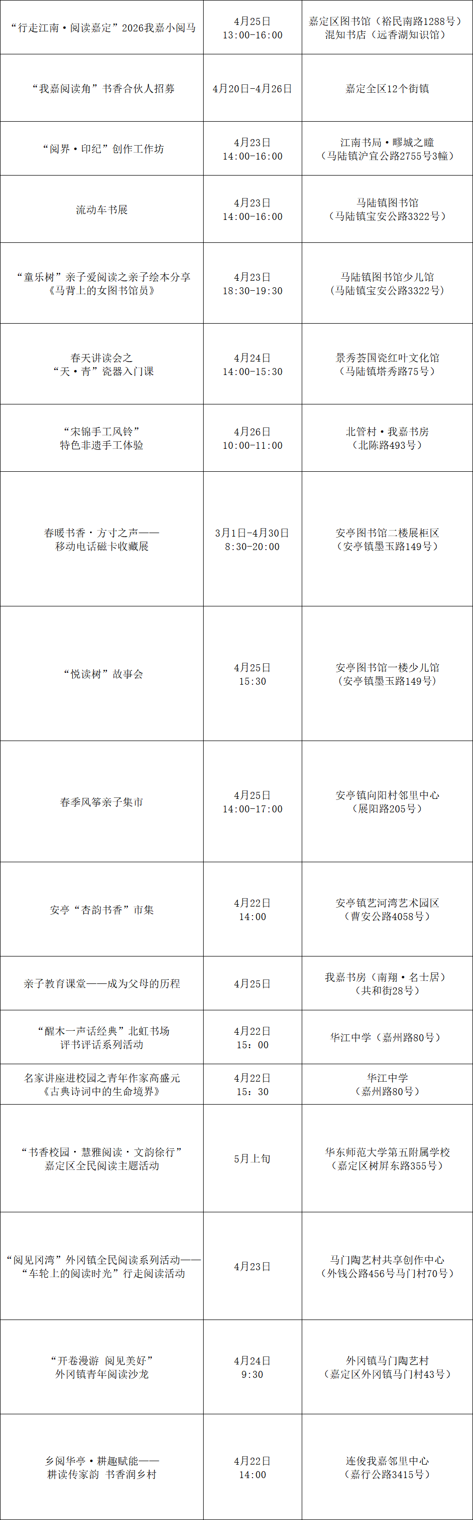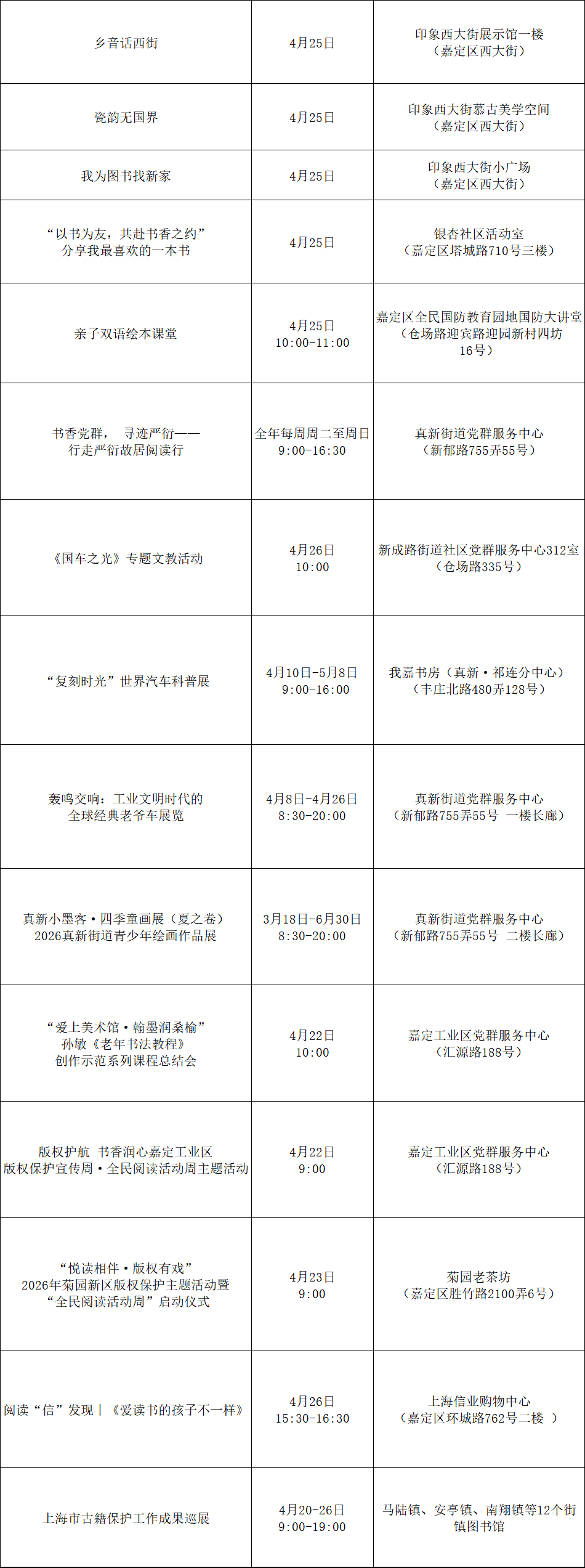 2026年嘉定读书月暨全民阅读活动周、公共图书馆服务宣传周重点活动菜单