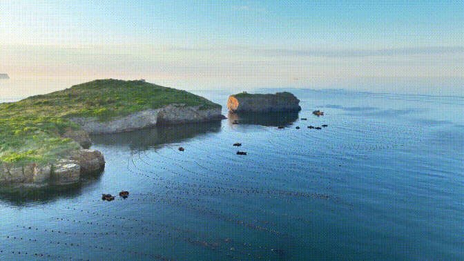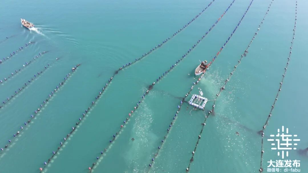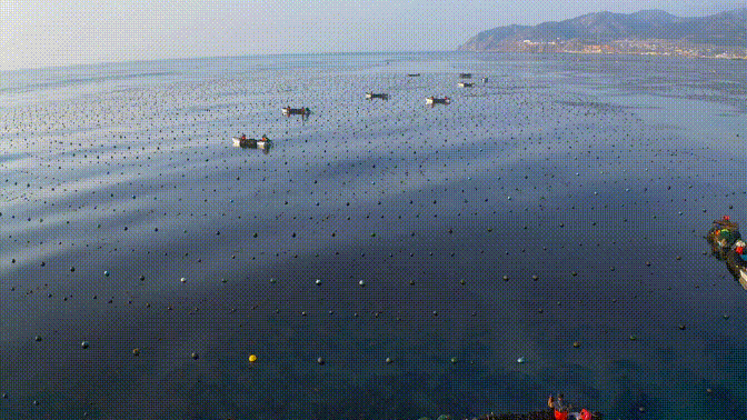 海面上颗颗浮球星罗棋布,通过绳索整齐地连接成浮筏,构成大海上阡陌纵横的田野。