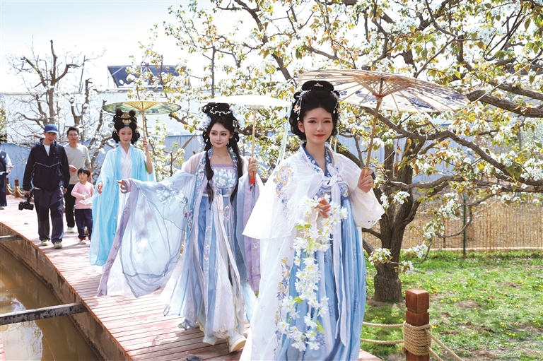 梨园里身着汉服打卡拍照的游客