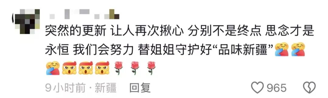 4月19日下午,上述账号还在贺娇龙账号评论区中留言:专注做好“品味新疆”新疆农产品宣传推广和助农事业,请贺主任放心,请一直关注“品味新疆”的大家放心,定不负期待。