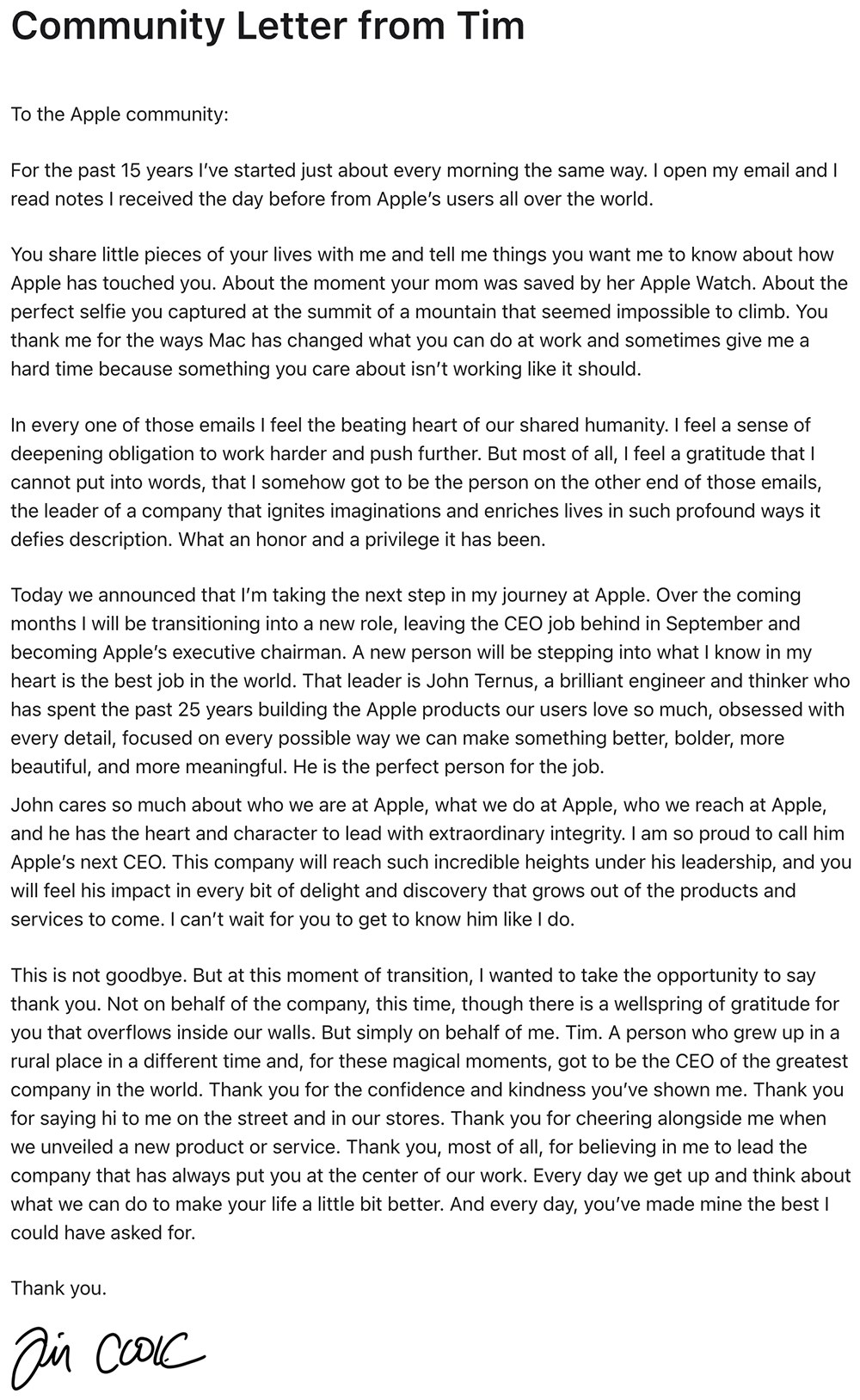 今天我们宣布,我将开启在苹果旅程的新篇章。在接下来的几个月里,我将逐步过渡到新的角色:我将于9月卸任首席执行官一职,转任苹果董事会执行主席。一位新人将接手这份我心中世界上最棒的工作。这位领导者就是约翰·特纳斯。他是一位杰出的工程师和思想者,在过去25年里,他一直致力于打造深受用户喜爱的苹果产品;他执着于每一个细节,专注于探索各种可能,只为让我们的产品变得更好、更大胆、更惊艳、更具意义。他是这个职位的绝佳人选。