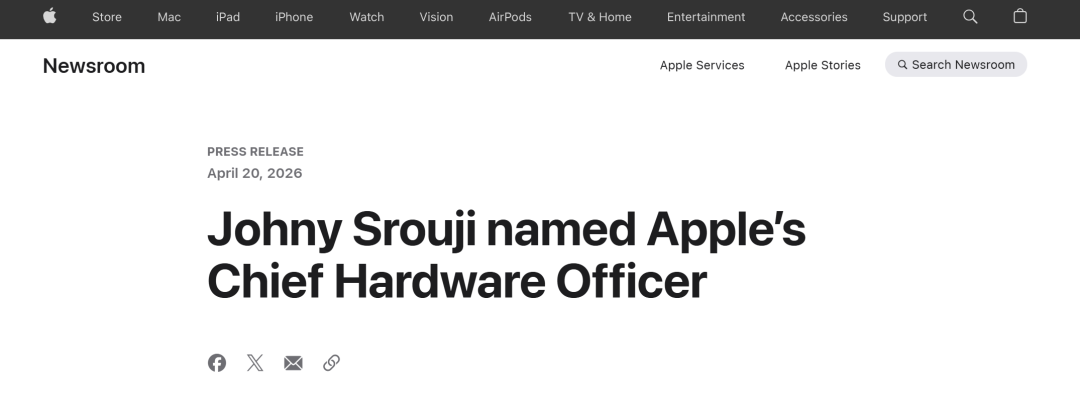 苹果关于约翰尼·斯鲁吉(Johny Srouji)正式出任首席硬件官的官方新闻: