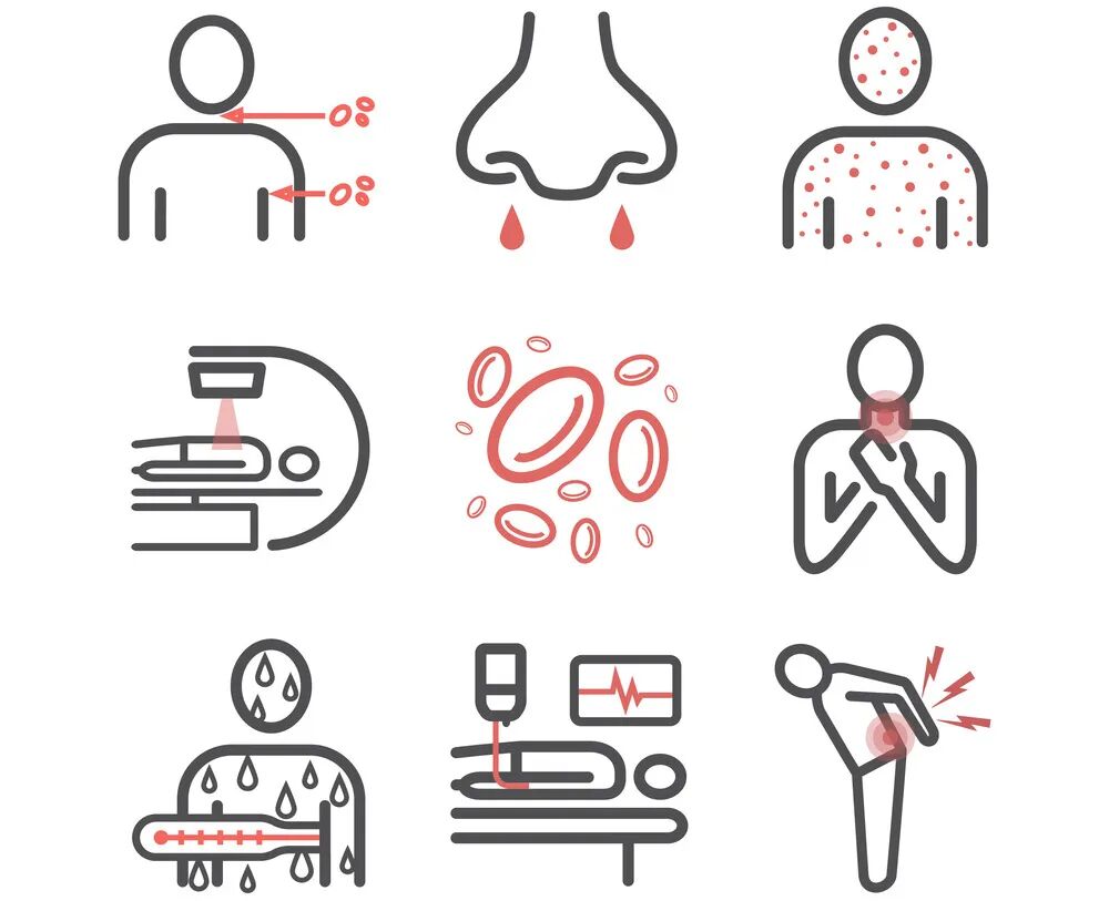 4.淋巴结、肝脾及髓外脏器浸润 多数患者会出现淋巴结肿大,主要分布在颈部、腋下、腹股沟及腹部等部位。肝脾大也是常见症状之一,尤其是在病情进展的情况下。肝脾大主要与白血病细胞浸润有关。白血病细胞通过血液和淋巴系统扩散,累及肝和脾,导致肝脾大。当白血病细胞浸润到骨和关节时,则会出现骨痛、关节痛及胸骨下端压痛等症状;浸润到中枢神经系统,则会出现头痛、呕吐、嗜睡等症状;此外,还会出现皮肤、口腔黏膜及齿龈浸润等情况。