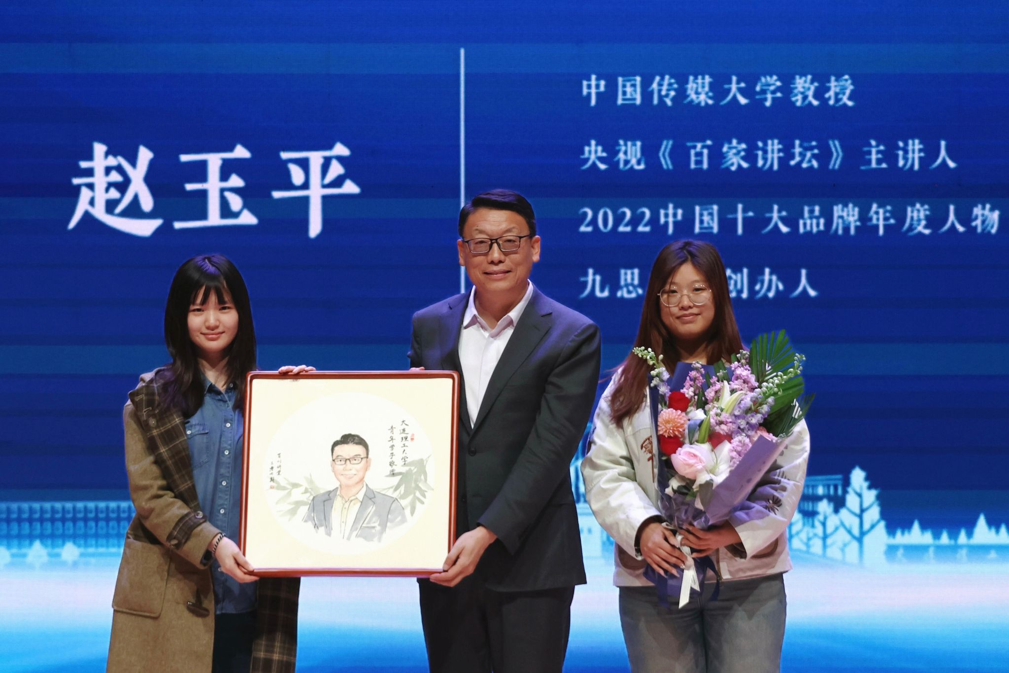 康旭东代表学校为赵玉平颁发“百川讲堂”嘉宾牌,学生代表赠送国画肖像,以表感谢与敬意。
