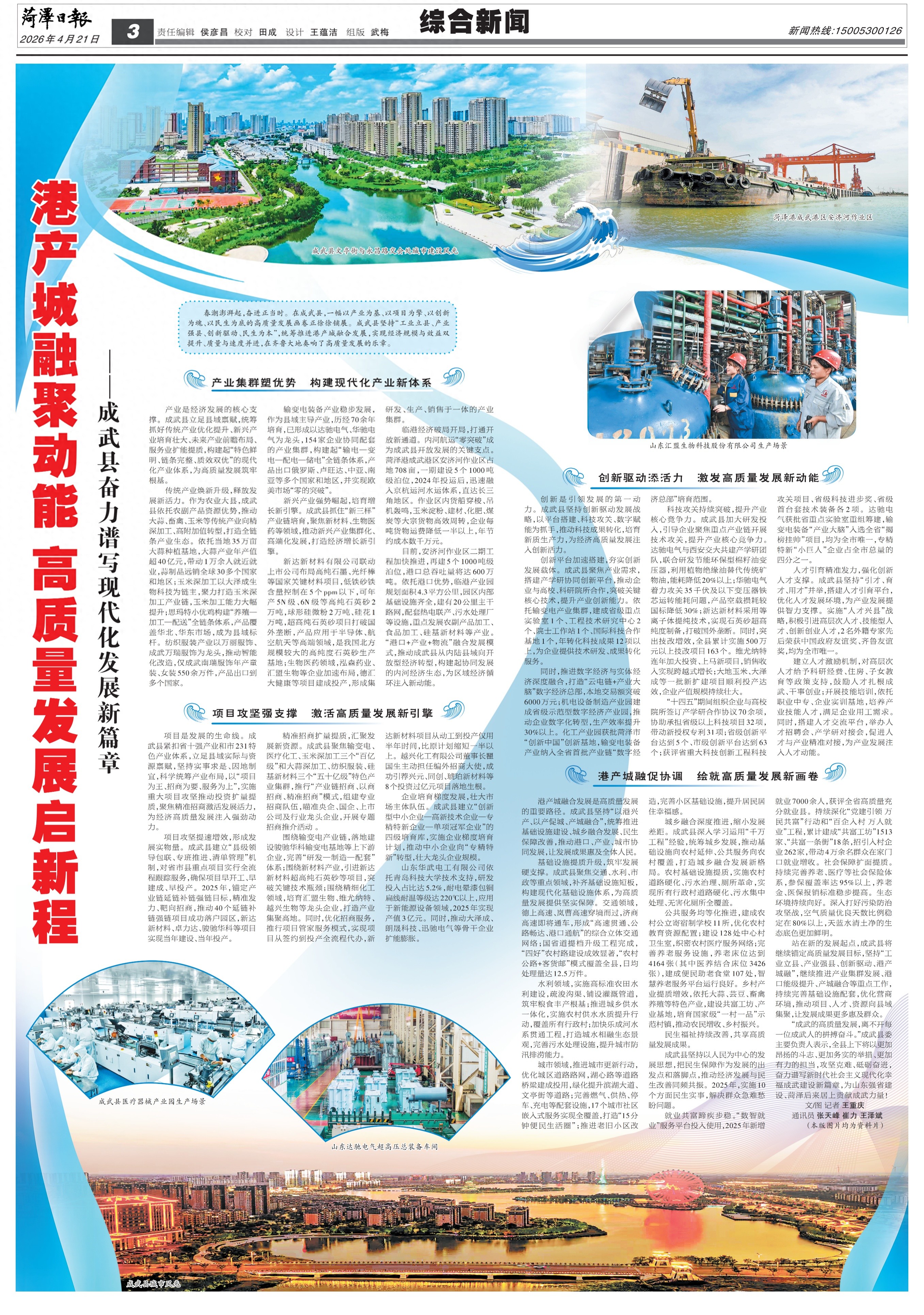 港产城融合发展是高质量发展的重要路径。成武县坚持“以港兴产、以产促城、产城融合”,统筹推进基础设施建设、城乡融合发展、民生保障改善,推动港口、产业、城市协同发展,让发展成果惠及全体人民。