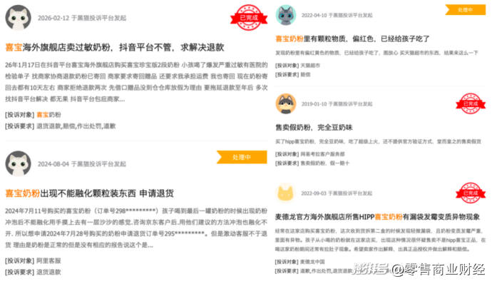 笔者查询黑猫投诉平台发现,有关“Hipp喜宝奶粉”的投诉大多集中在婴幼儿食用后过敏、奶粉出现颗粒物质、发霉变质等问题。
