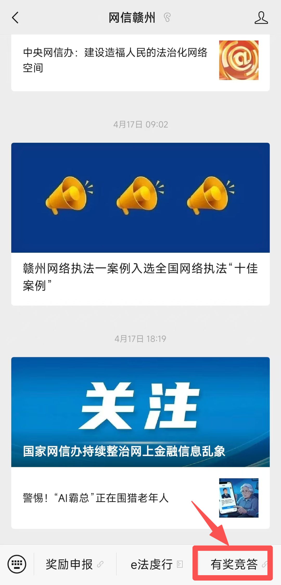 或者在“网信赣州”微信公众号菜单栏点击“有奖竞答”参与活动。