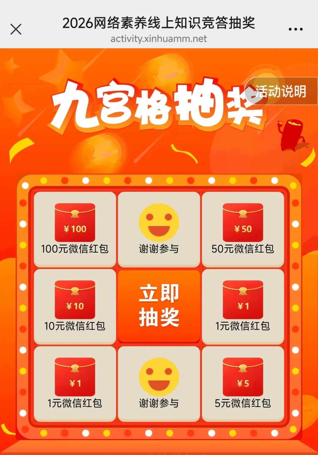 参与答题,获得100分,即可参与抽奖活动。中奖后领取红包,可直接提现到微信。