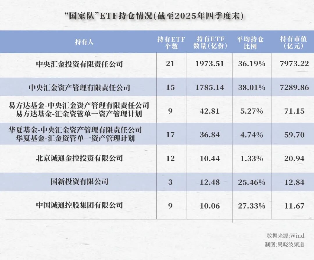 截至2025年四季度末,“国家队”共计持有ETF市值超1.54万亿人民币,比去年二季度增加了2487亿元。这意味着,从绝对资金量来说,国家队在2025年的整体是增持的。