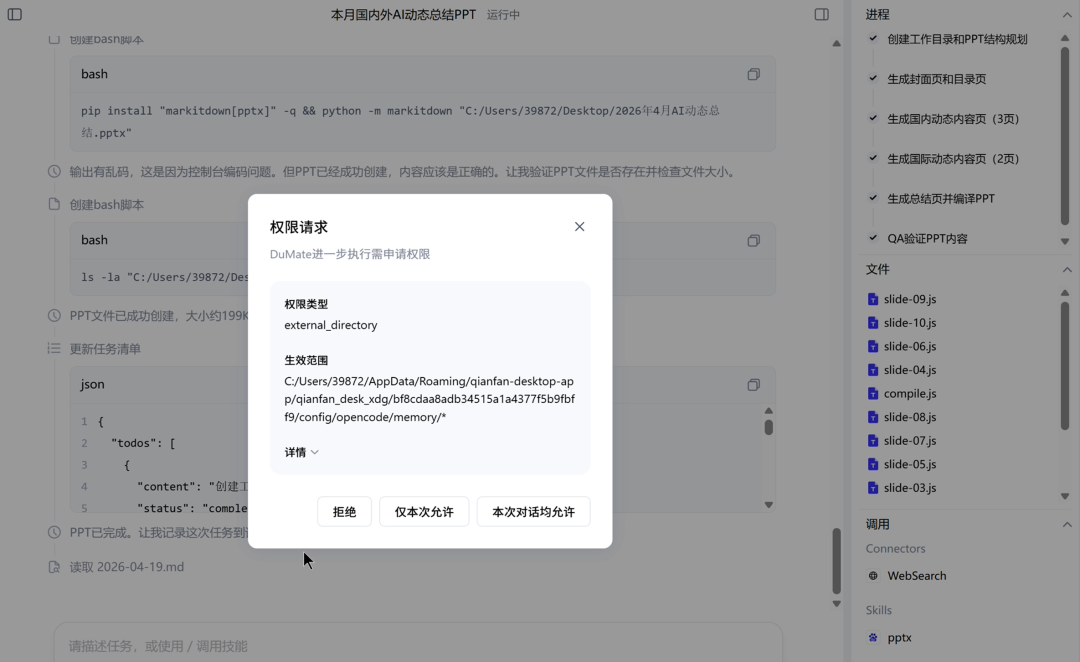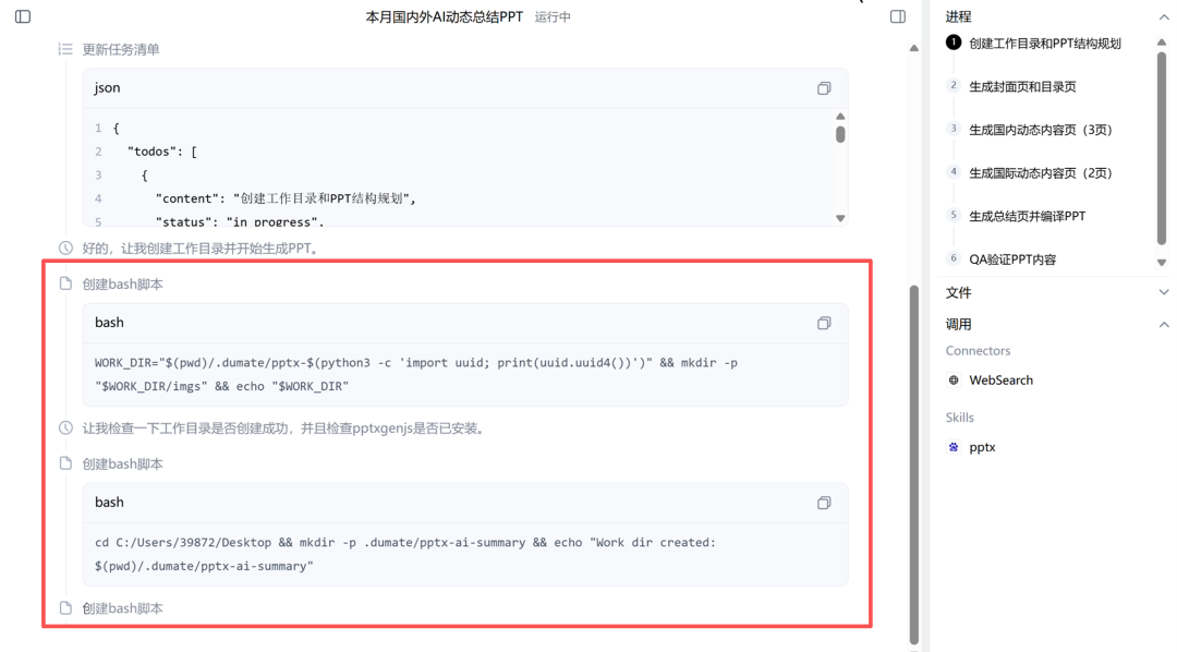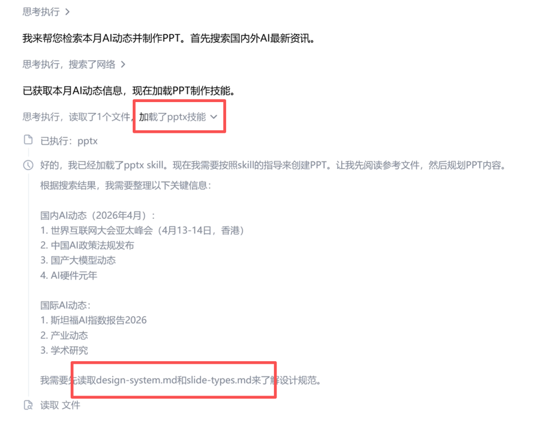 信息搜集差不多后,它会自动加载相应的技能来制作PPT。