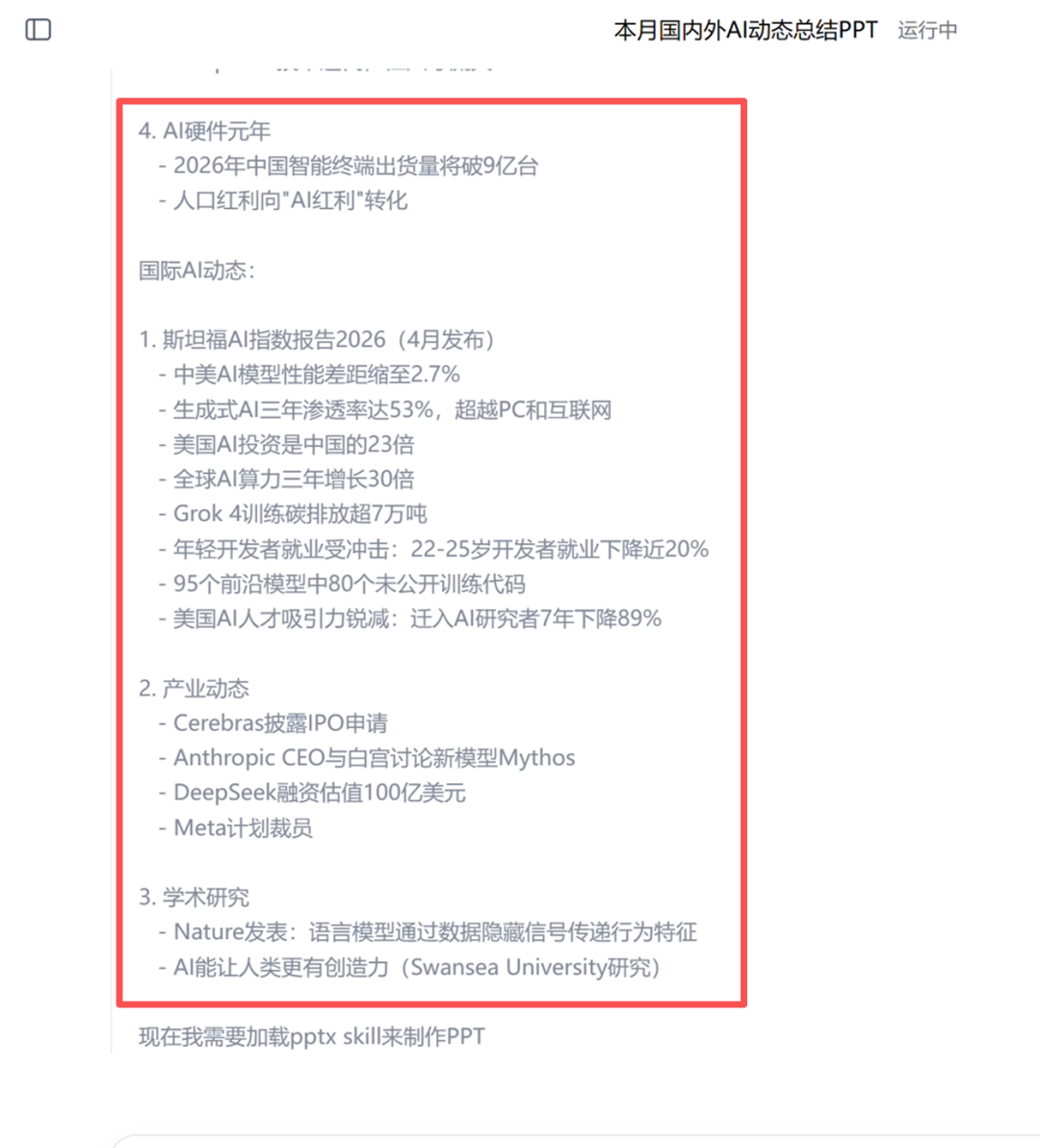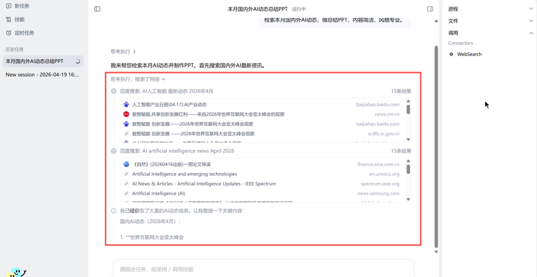 比如,让它检索本月国内外AI动态,做总结PPT,内容简洁,风格专业。