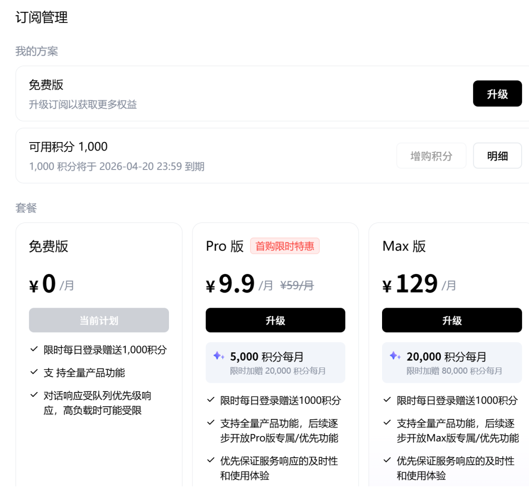 免费版每日1000积分,覆盖绝大多数日常办公场景。付费Pro版和Max版提供更多积分选择,优先保证服务响应的及时性和使用体验,近期还有限时加赠积分和邀请活动,邀请你的搭子用搭子,双方都能领积分。
