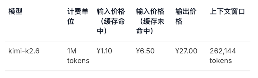 在API方面,K2.6维持分级计费模式,但相比K2.5价格有明显上涨。具体来看,K2.6每百万Token的输入价格为6.5元(缓存未命中),较K2.5的4元上涨了约62.5%;缓存命中情况下的输入价格为1.1元,较之前的0.7元也有所提升;而输出价格则从21元上调至27元。在窗口容量上,K2.6提供了262,144 Token的上下文窗口支持。