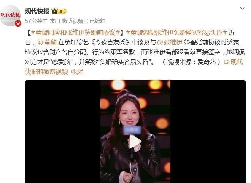 3月中旬,董璇在综艺《今夜喜友秀》中爆料,她跟现任老公张维伊签署婚前协议的细节。董璇说,张维伊“他看都没看就直接签字”,还给张维伊贴上了“恋爱脑”的标签,并笑张维伊“头婚确实容易头昏”。