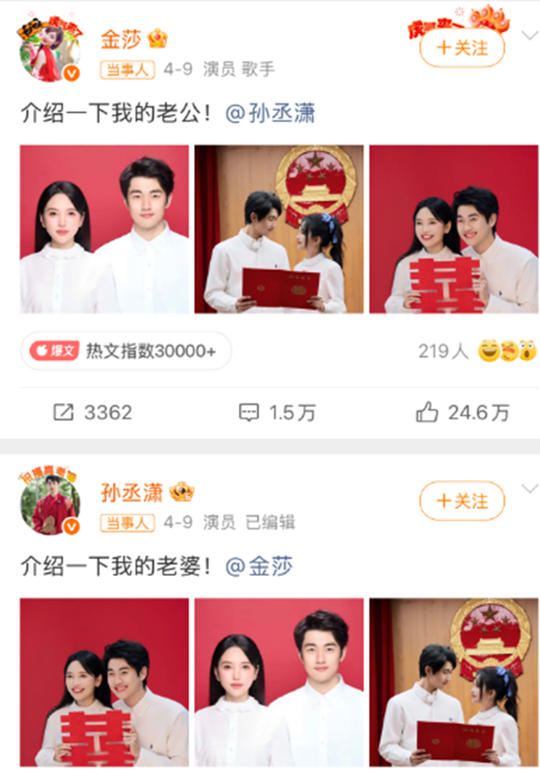 4月9日中午,金莎在微博上发文“介绍一下我的老公! 孙丞潇”,并配上三张结婚登记照片。 几分钟后,孙丞潇也发了同样的照片回应:“介绍一下我的老婆! 金莎”。
