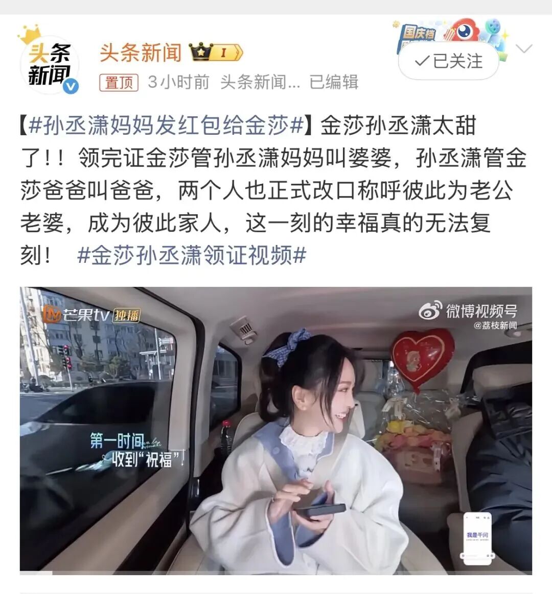 最新一期节目中,领完证的金莎管孙丞潇妈妈叫婆婆,孙丞潇妈妈还给了“改口费”,孙丞潇也管金莎爸爸叫爸爸。两人眉梢嘴角都是化不开的甜蜜。