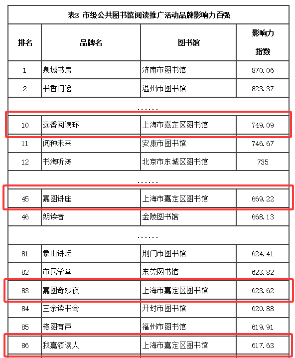 市级图书馆包含副省级市、国家级新区、直辖市所辖区及其他市级图书馆,共涉及阅读推广活动品牌1618个。嘉定区图书馆有4个品牌入选百强:远香阅读环位列第10名,嘉图讲座位列第45名,嘉图奇妙夜位列第83名,我嘉领读人位列第86名。