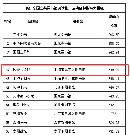 评选对象覆盖全国534个公共图书馆,包括国家图书馆、所有省级和市级(含15个副省级城市)公共图书馆,以及省会城市和副省级计划单列市所辖区县的主要公共图书馆(不含港澳台地区),从5300余个候选品牌中筛选出2303个具有高辨识度的阅读推广活动品牌。嘉定区图书馆的“远香阅读环”入选影响力百强,位列第47名。