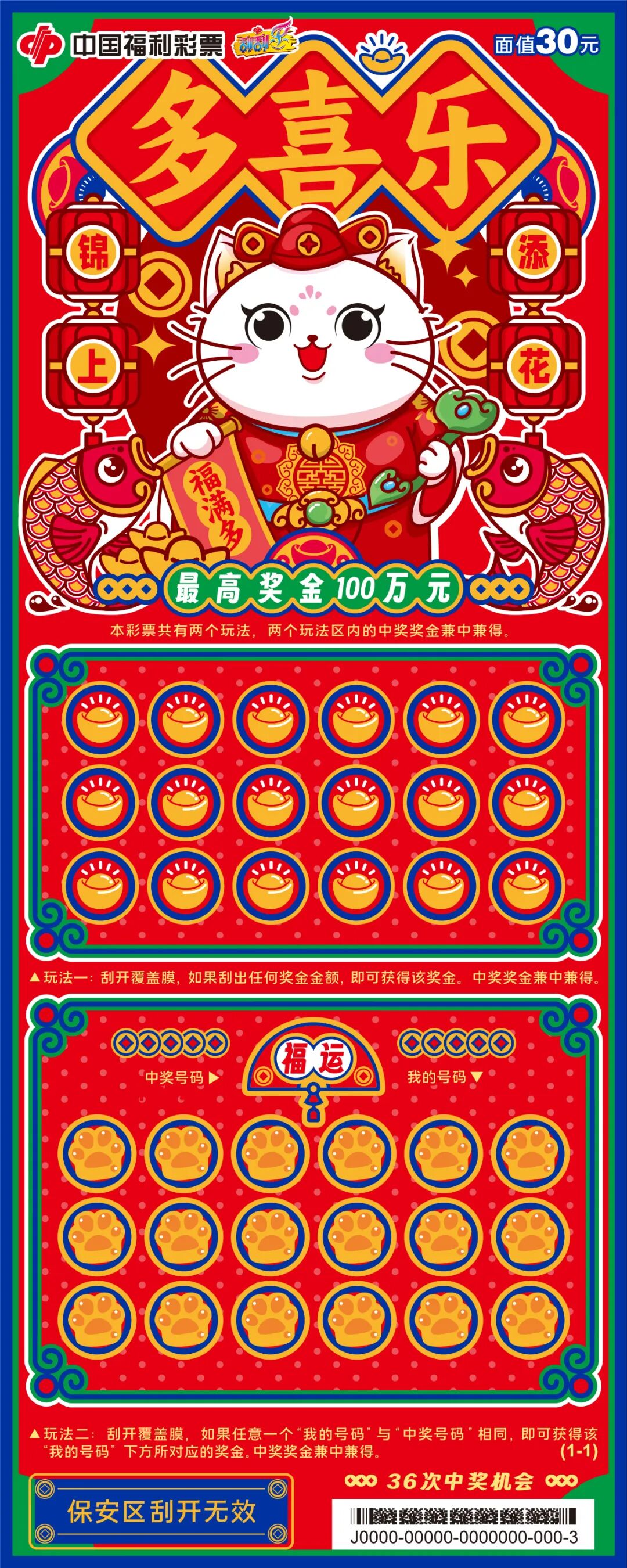 票面以传统红为底色,搭配吉祥的金币元素与萌趣国潮卡通形象,“多喜乐”将千年喜庆文化融入现代设计美学。票面锦鲤环绕、金元宝点缀,刮开瞬间仿佛开启装满祝福的宝盒,既有喜庆祝福的氛围,又不失潮流和趣味性。