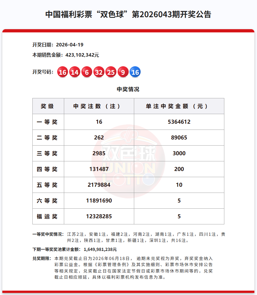 双色球第2026043期:中出一等奖16注,筹集公益金1.52亿元