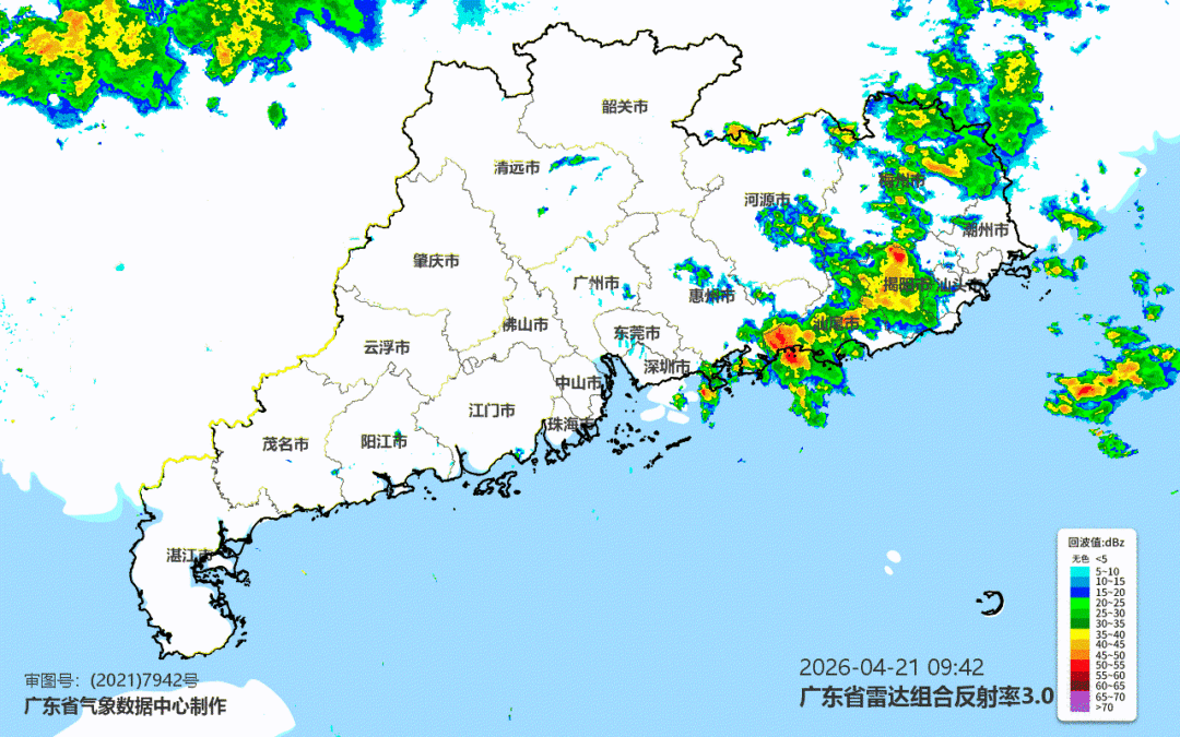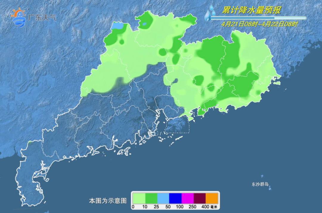21日,粤北、珠三角东部和粤东市县多云到阴天,有(雷)阵雨局部大雨或暴雨,其余市县多云局部有(雷)阵雨,各地雷雨时局部伴有短时强降水、8级左右短时大风等强对流天气。最高气温:粤西、珠江三角洲大部市县30~33℃,其余市县26~29℃。
