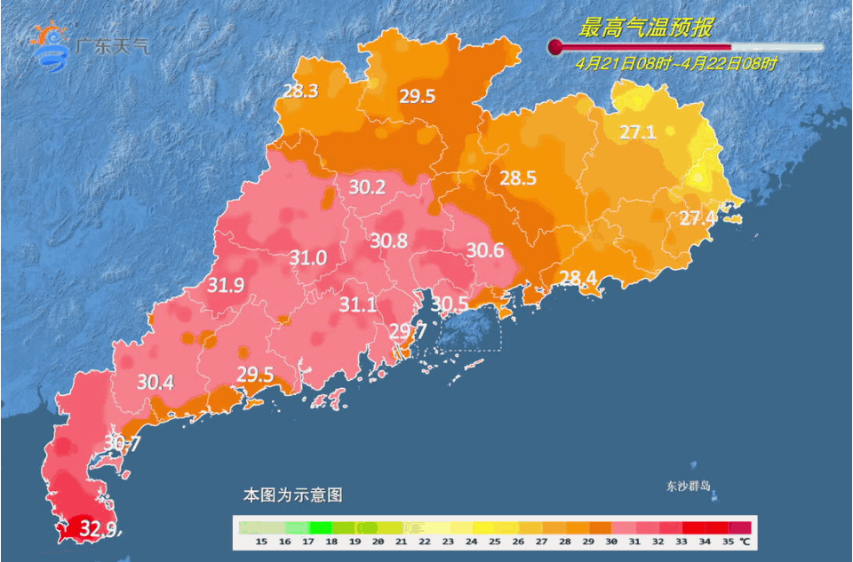 22日白天,韶关及清远的北部市县多云到阴天,有大雨局部暴雨或大暴雨,粤西、珠江三角洲中南部和粤东市县多云,局部有(雷)阵雨,其余市县多云到阴天,有(雷)阵雨局部大雨或暴雨,各地雷雨时伴有短时强降水、强雷电、8级局部10级的短时大风等强对流天气。最高气温:韶关及清远的北部、肇庆北部市县24~27℃,雷州半岛市县32~35℃,其余市县29~32℃。