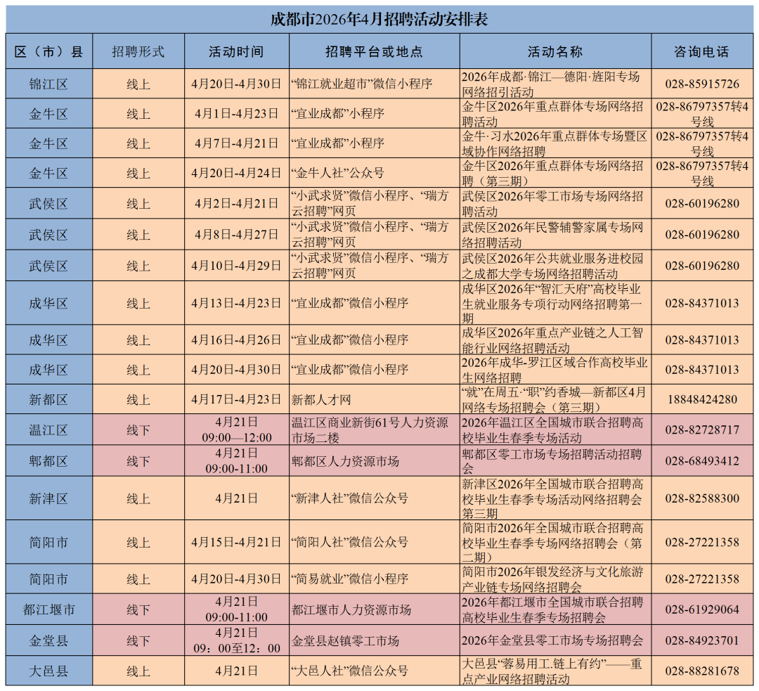 今日,成都一系列线上招聘活动密集开展,具体招聘信息如下表,请大家留意场次安排,提前做好准备。温馨提示:近期,“宜业成都”小程序维护中,如出现搜索不到的情况,可通过“成都人社局”微信公众号点击微服务一就业经办栏目进入。招聘活动可能因天气、场地等因素临时调整,为确保您顺利参会,建议提前拨打活动预留电话确认详情。