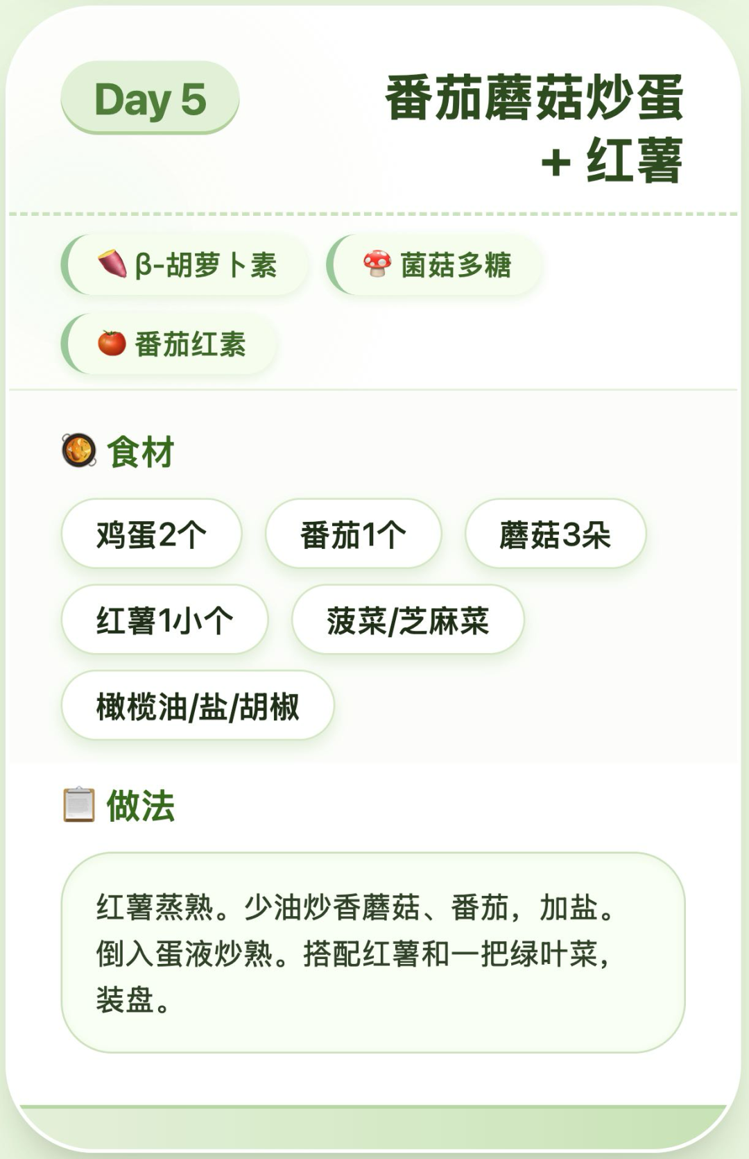 Day5️⃣:番茄蘑菇炒蛋配红薯,热乎乎的一盘,特别养胃。