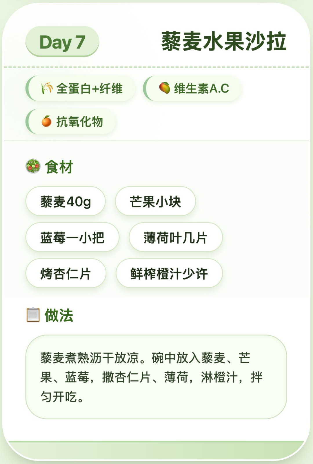 我曾给自己定了一个小目标:7天早餐不重样,每一餐都围绕抗氧化、稳血糖、护肠道来搭配。
